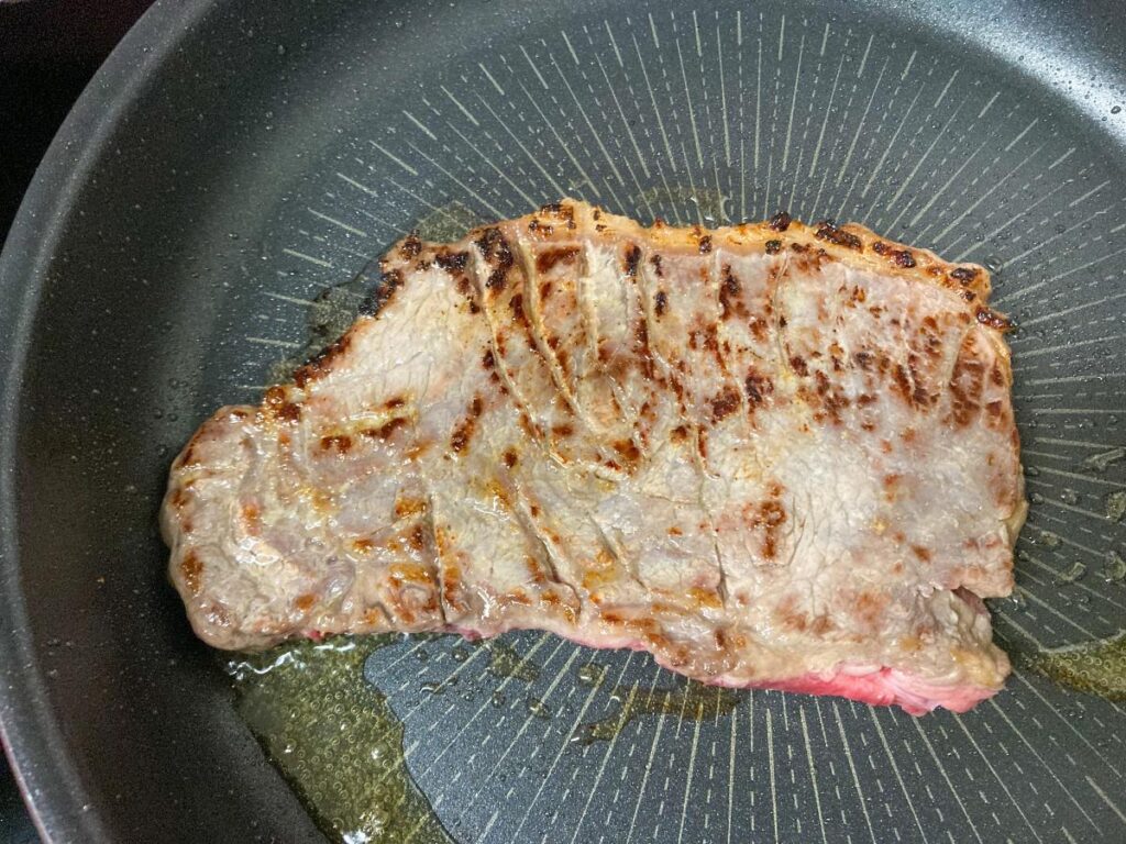 フライパンをしっかり熱してから肉を入れ、片面を1分ずつ焼きます。