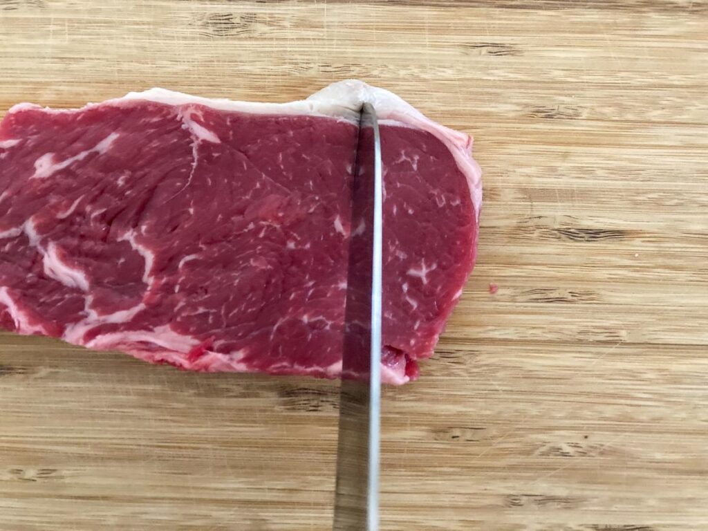 ステーキ肉が硬くなる原因のひとつは、肉の筋です。