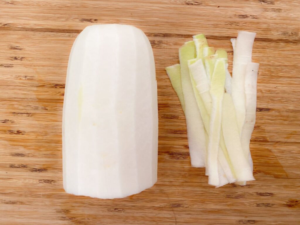 最初に大根の皮をむいて、縦4等分に切るよ。細めの棒状にしておくと味がしみやすいんだ。