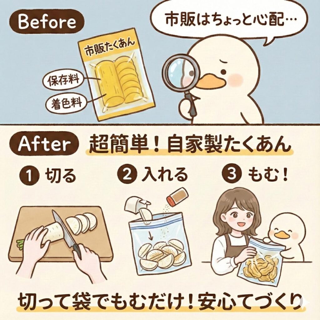 市販のたくあんって便利だけど、添加物が少し気になるんだよね。