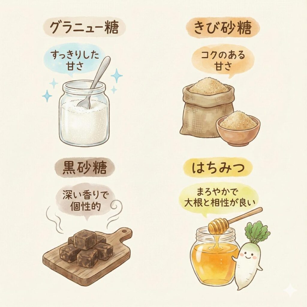 一番大切なのは砂糖の量だよ。大根と砂糖を“5:1”にすると味が整いやすいよ。