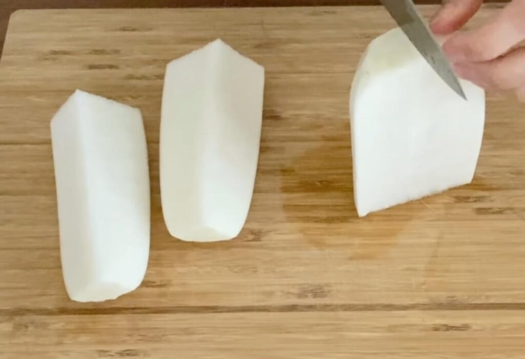 まずは大根の下処理。皮をむき、縦4等分にすると調味料が均等に行き渡ります。