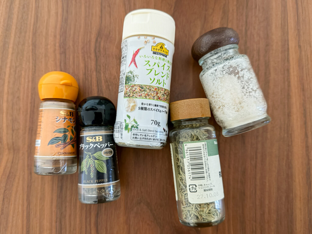マジックソルト、シナモン、ブラックペッパー、ガーリックパウダー……。