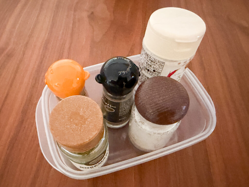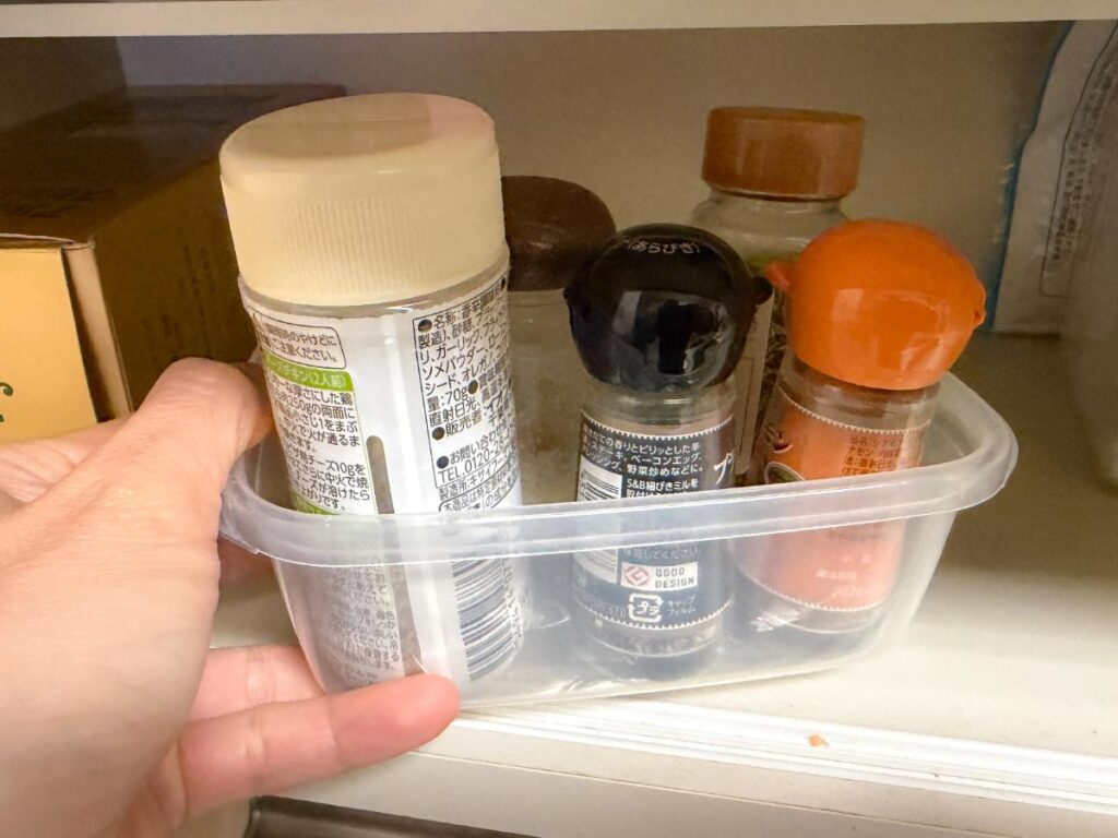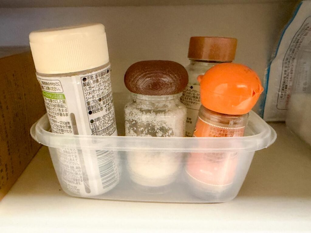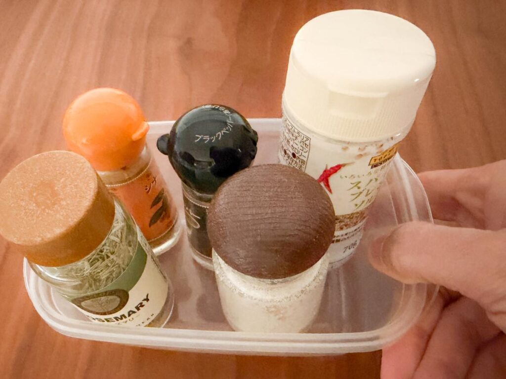 1つのタッパーに、マジックソルトやシナモンなどの小瓶が3〜4本ほど収まるサイズのものが多いので、使い勝手もいいですよ。