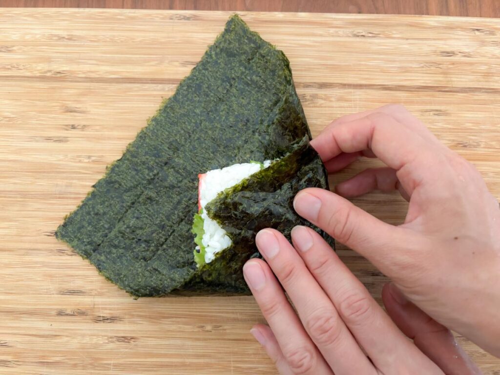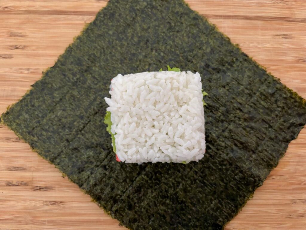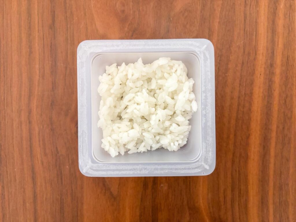 ご飯を入れすぎると海苔で包みきれなくなります。容器の半分くらいを目安にすると、キレイに仕上がります。