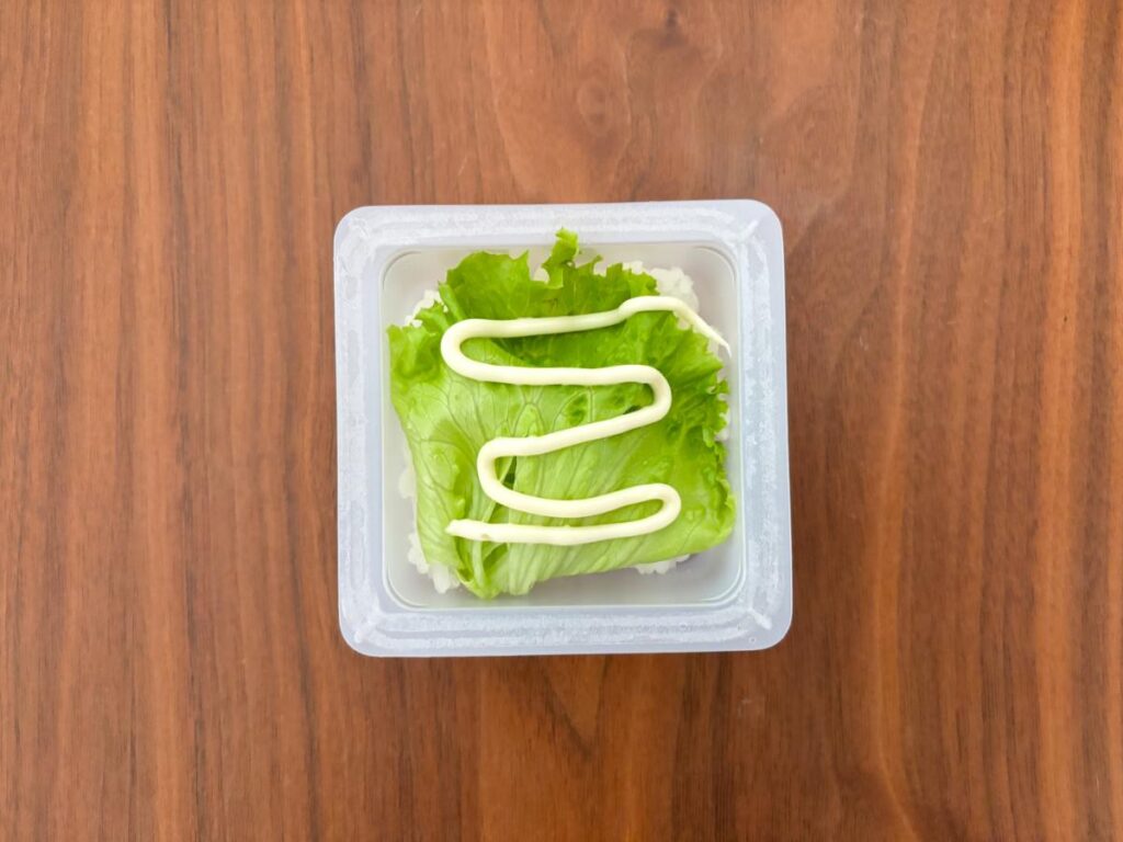 2)フリルレタスをかぶせて、マヨネーズを回しかけます